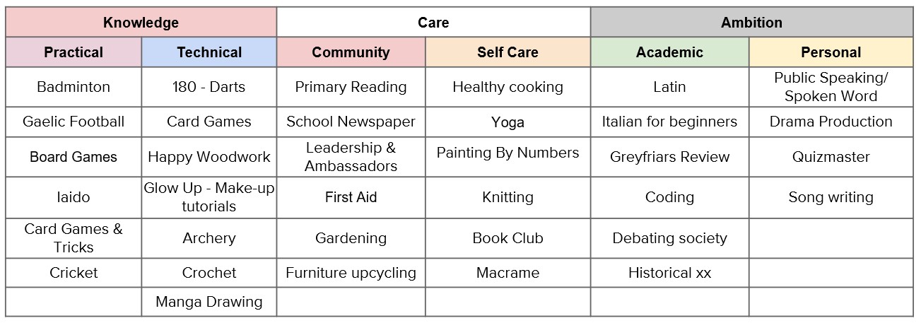 As part of the Catholic life of the school, there is a compulsory community enrichment course that runs for at least one term per year. This may consist of charity work or other activities that contribute to the school community such as a school newspaper or gardening. Our 6th form students support the enrichment groups as part of their own contribution to the school community and to develop their leadership skills. Our enrichment programme is centred around our values of Knowledge, Care and Ambition.